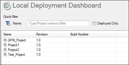 Local Deployment Dashboard, available from the Console Tree under each registered server, is a list of all Projects located on this server that also displays each Project revision and build number (of the package most recently deployed on the server). The list can be filtered using Quick Filter and refreshed using the Refresh command available after right-clicking the Local Deployment Dashboard node on Console Tree. To see only deployed Projects, select Deployed Only check box.