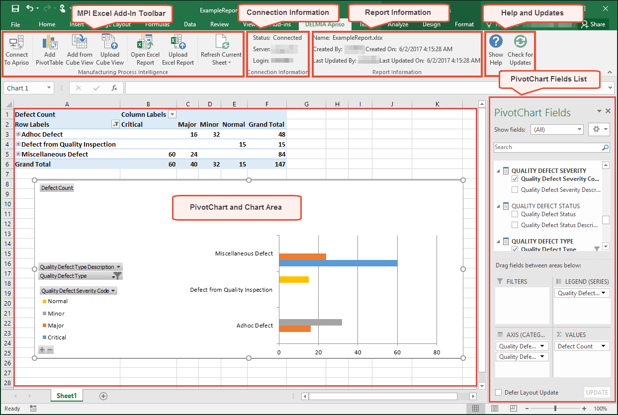 The DELMIA Apriso MPI Excel Add-in allows for analysis data to be rendered in order to answer business questions. It enables the user to focus on business problems and root cause issues instead of having to create dozens of reports for predefined issues.