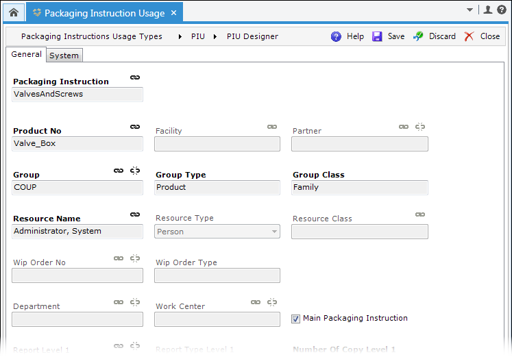 In the Packaging Instruction Usage (PIU) Designer editor you can determine the properties of a Packaging Instruction associated with a predefined Usage Type.