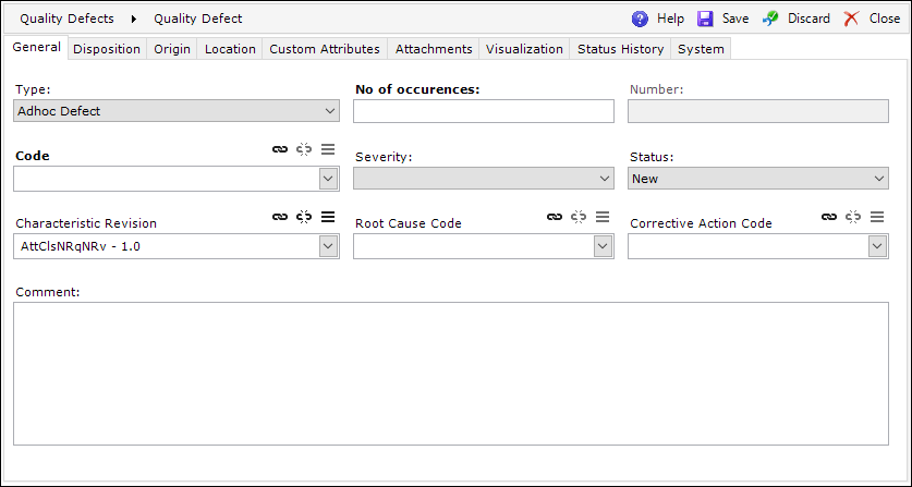 This section contains general data about the Quality Defect, such as its Type, No. of occurrences, severity, etc.