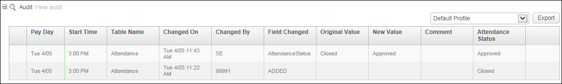 | Start Time | The current start time of the row being shown in the audit so that you may visually associate the row in the audit to the row in the attendance or labor grids. |