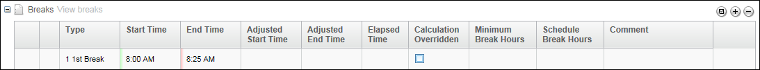 | Adjusted End Time/Actual End Time | The name of the column changes based on the EditAdjustedTimes setting in Central Configuration Documentation. The default setting displays the adjusted end time for this break row. |