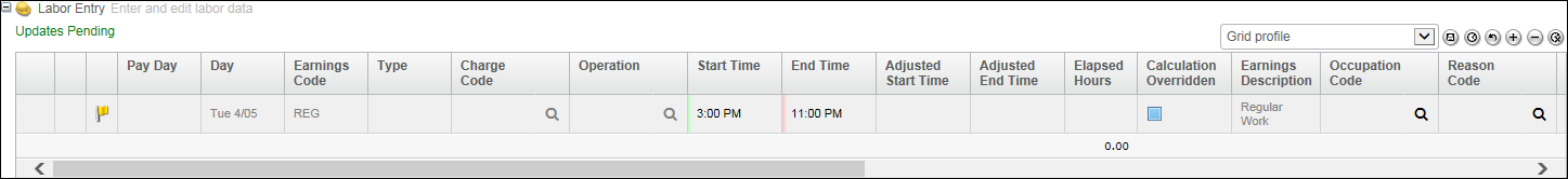 There is a separate Labor Entry grid for employees whose classification is Hourly. For information on the Salaried Labor Entry grid, refer to Salaried Time-Labor Entry Grid.