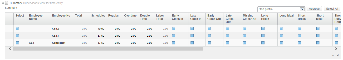 The Summary grid provides a list of all of the employees from the selected node (group or employee). For example, if a Department node is selected in the Resource Explorer, the Summary grid will list one row for each employee in the Department to which the Supervisor is linked.