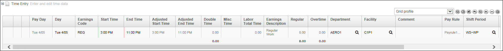 | Regular | The hours computed as Regular (usually 8.0 hours, which is a normal shift). |