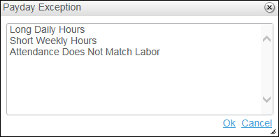 After an attendance record has been signed off on by an employee or has been approved by the Supervisor, clicking the Pay Day column will invoke a pop-up window with sign-off/approval exceptions for the selected time record and/or for the whole Pay Period: